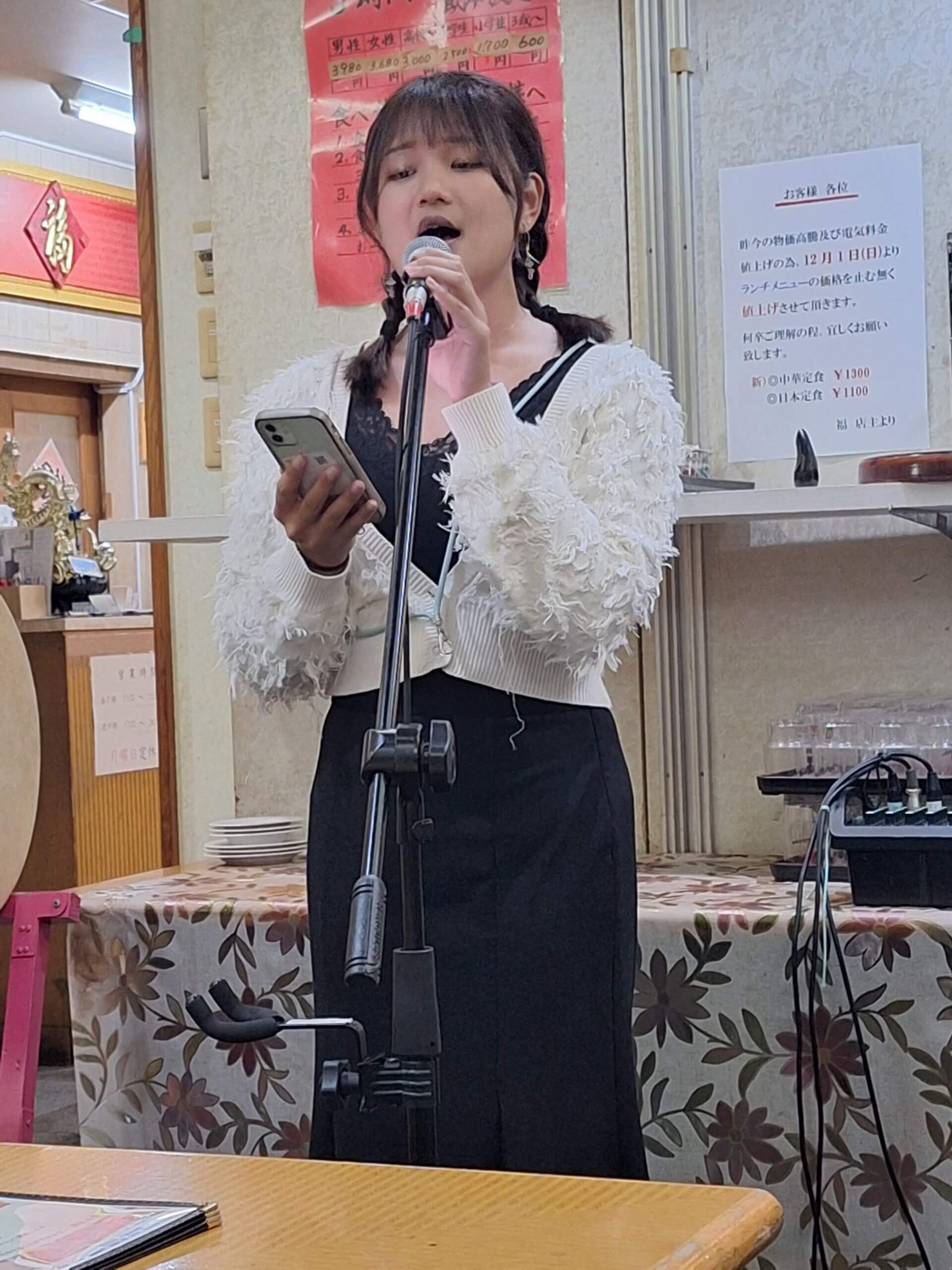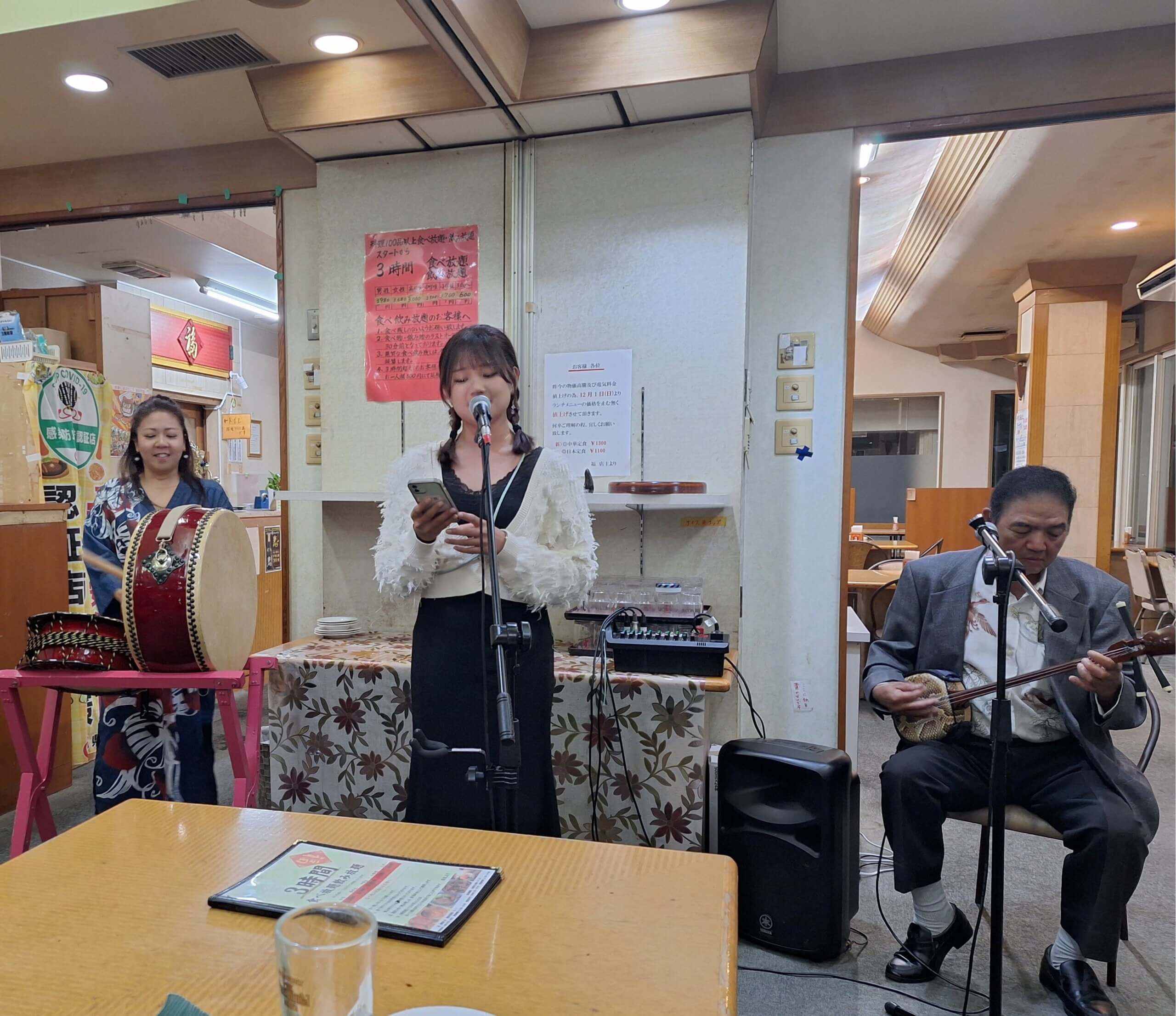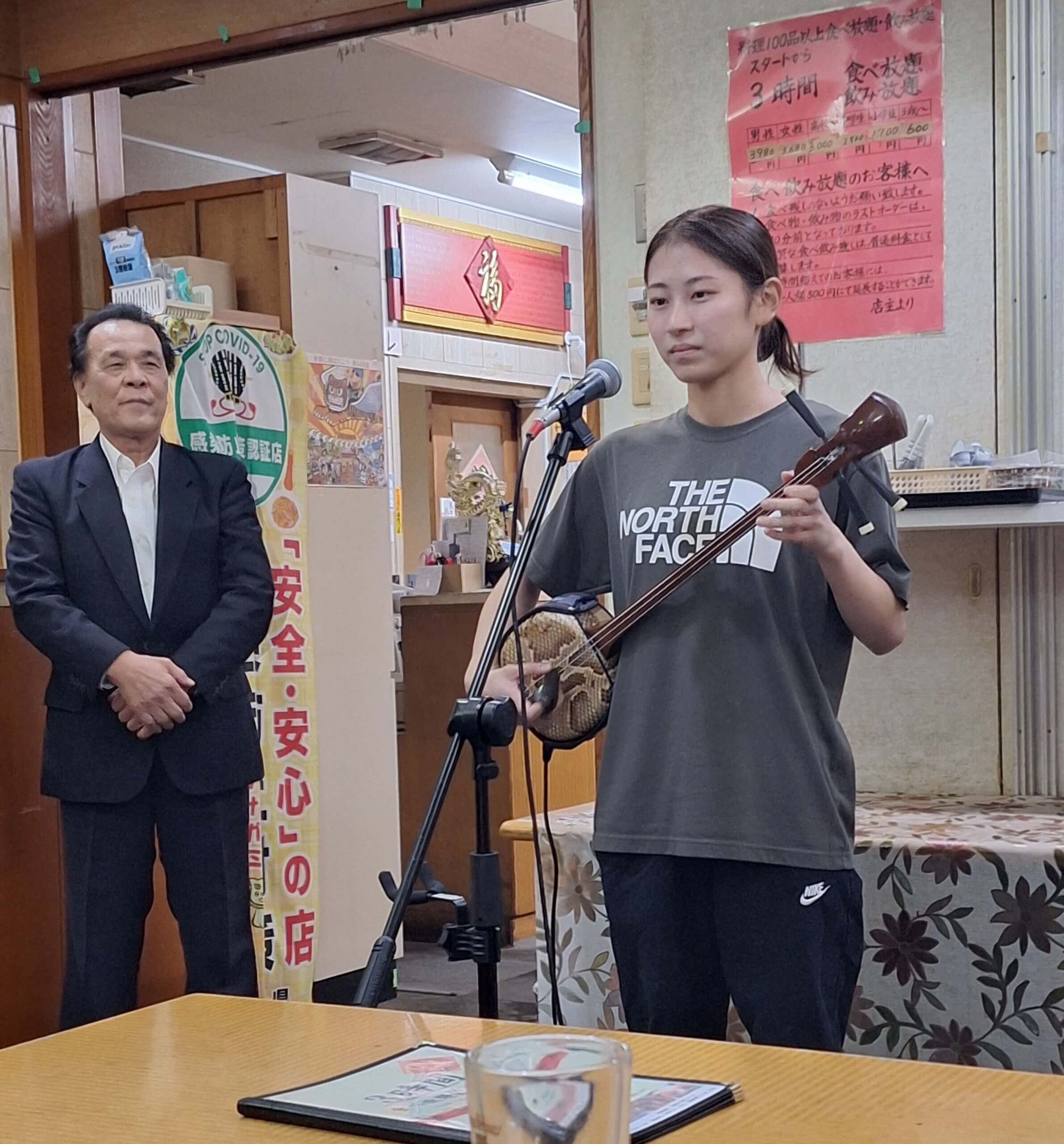 愚生が審査委員長を務めた「第2回U-18島唄者コンテスト」で見事!中学3年(13歳)で最優秀賞を受賞した。宮根帆音ちゃんがパブリックレストランでアルバイトしていて、7年ぶりに遭遇しました(現琉球大学生)。折角だから「歌ってくれない?」とお願いすると、しっかり「とぅばらーま」をすばらしく歌ってくれました。会員から拍手喝采でした。