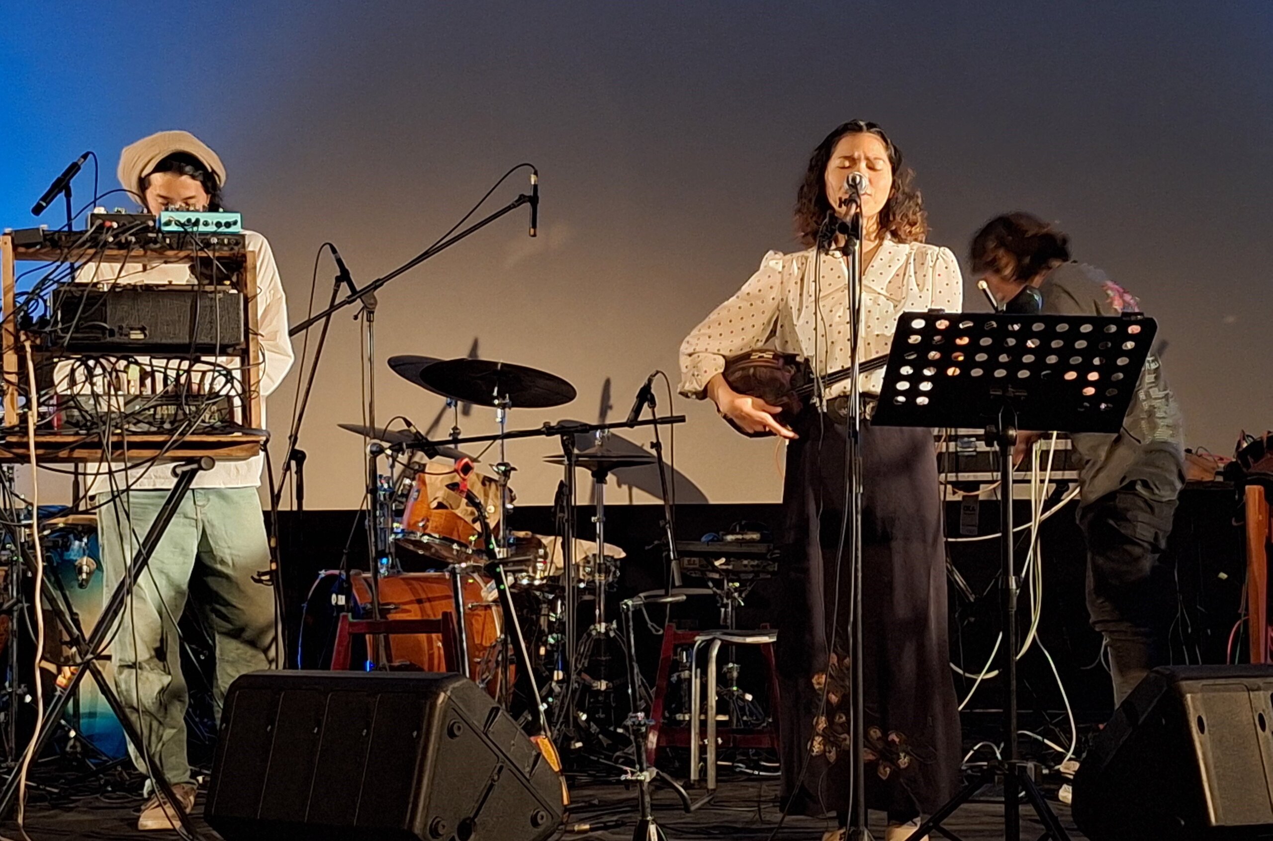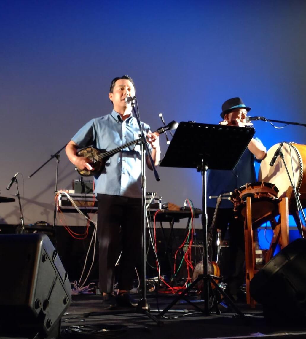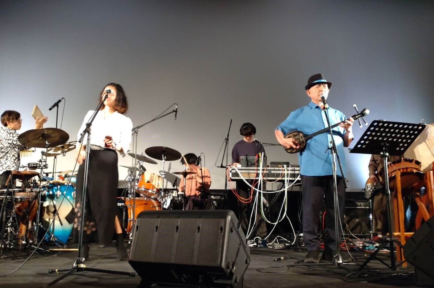 6名の編成隊のチョコは今回、初めて沖縄音楽とコラボに「沖縄の音楽は不思議だ」裏と表に変わり