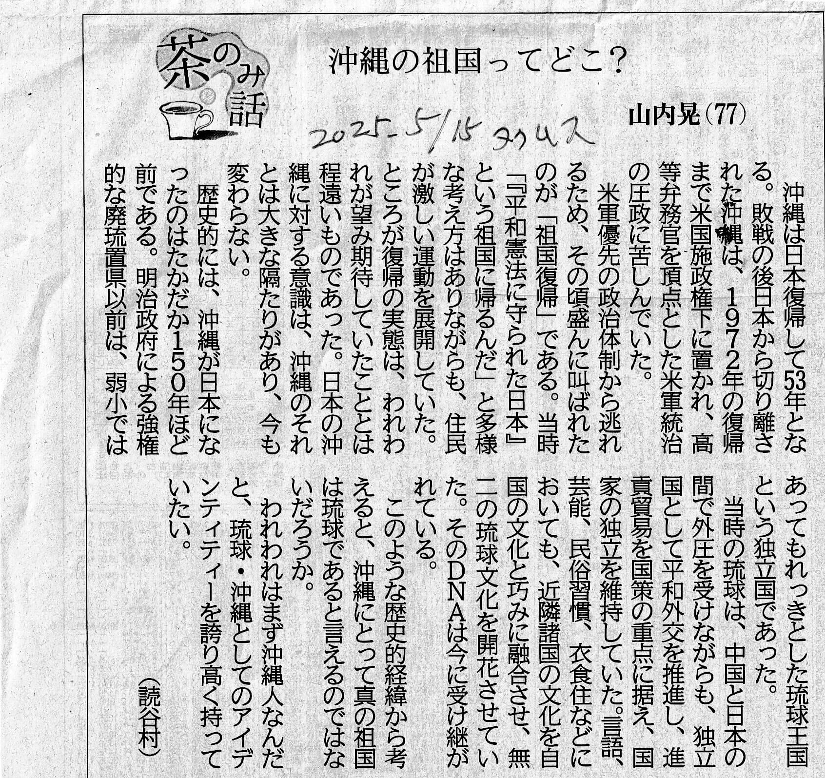 今日の沖縄タイムス「茶飲み話」山内晃(77)が