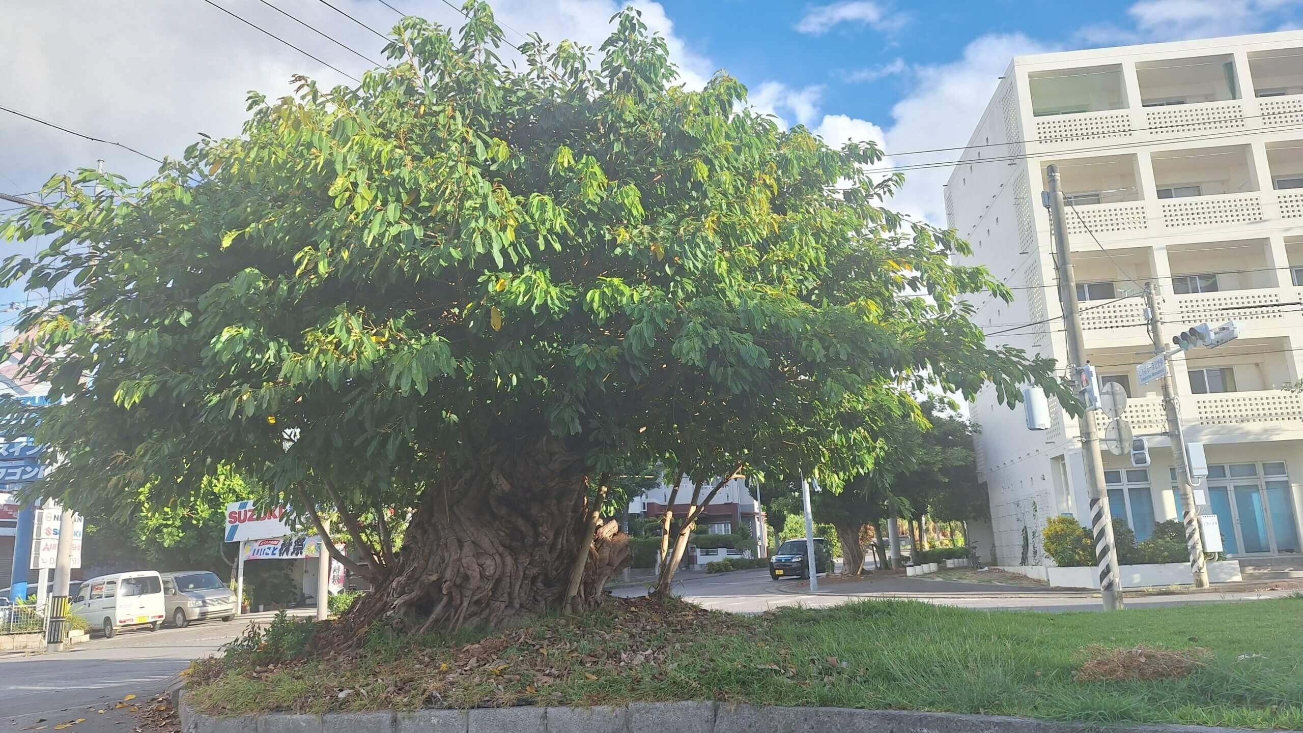 現場を見てホットしました。強風で倒れたアコウ木は見事再生され威風堂々と仲道ロータリーに
