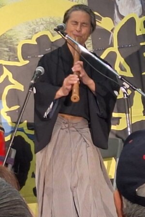 「津軽あいや節」数曲演奏してから三味線の説明、創作曲「縄文」を尺八で披露、またサービス