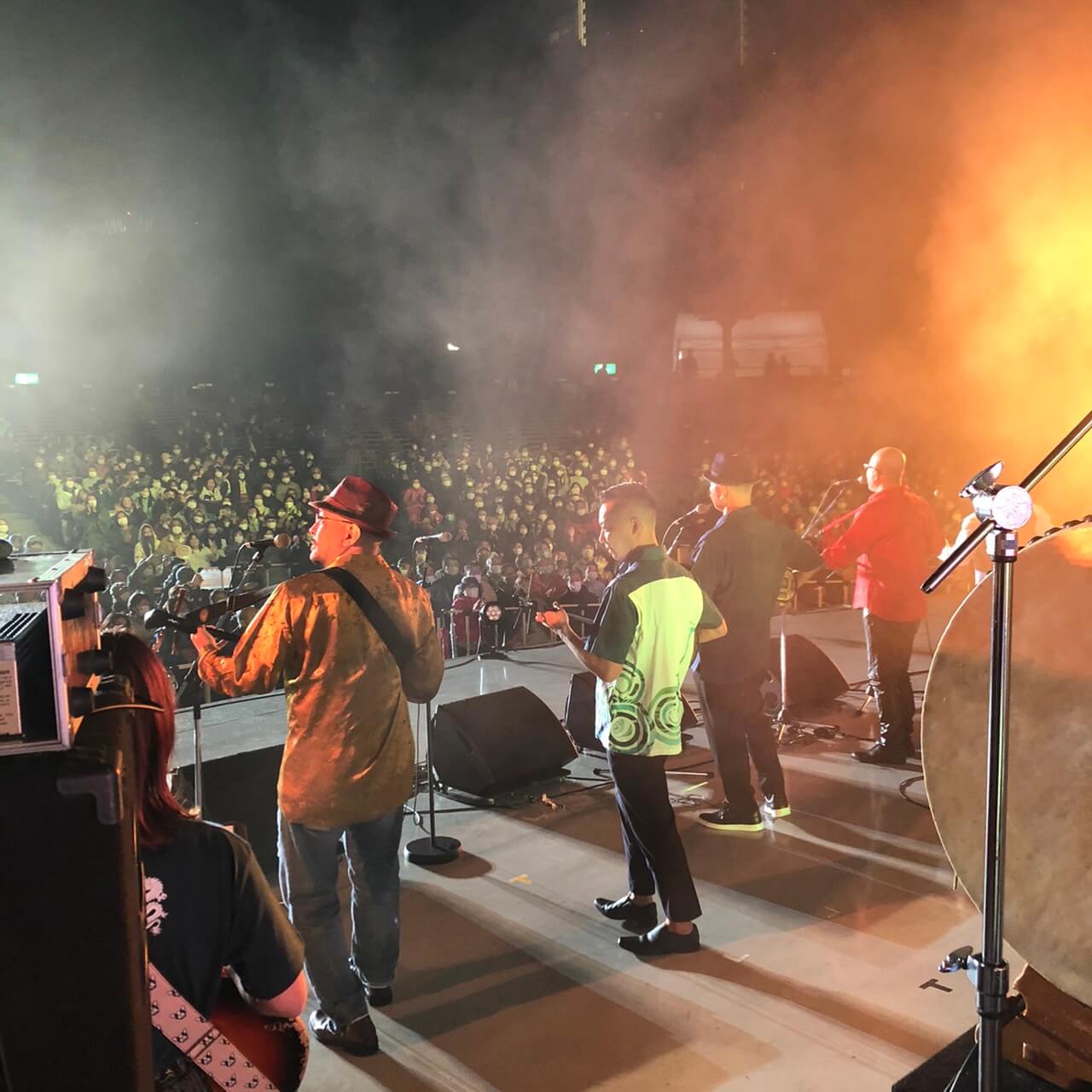 愚生のステージ、大城朝夫(太鼓)、伊藤幸太(うた・三線)大工(うた・三線)、苗子(琴)