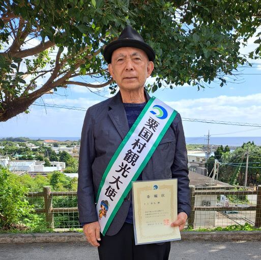 第一号の観光大使の愚生。粟国の浜村をバックも