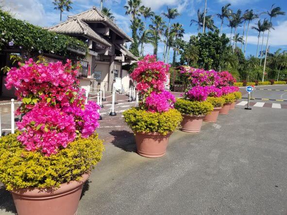 沖縄の青空と赤・ピンク色のコントラストが良く似合う。