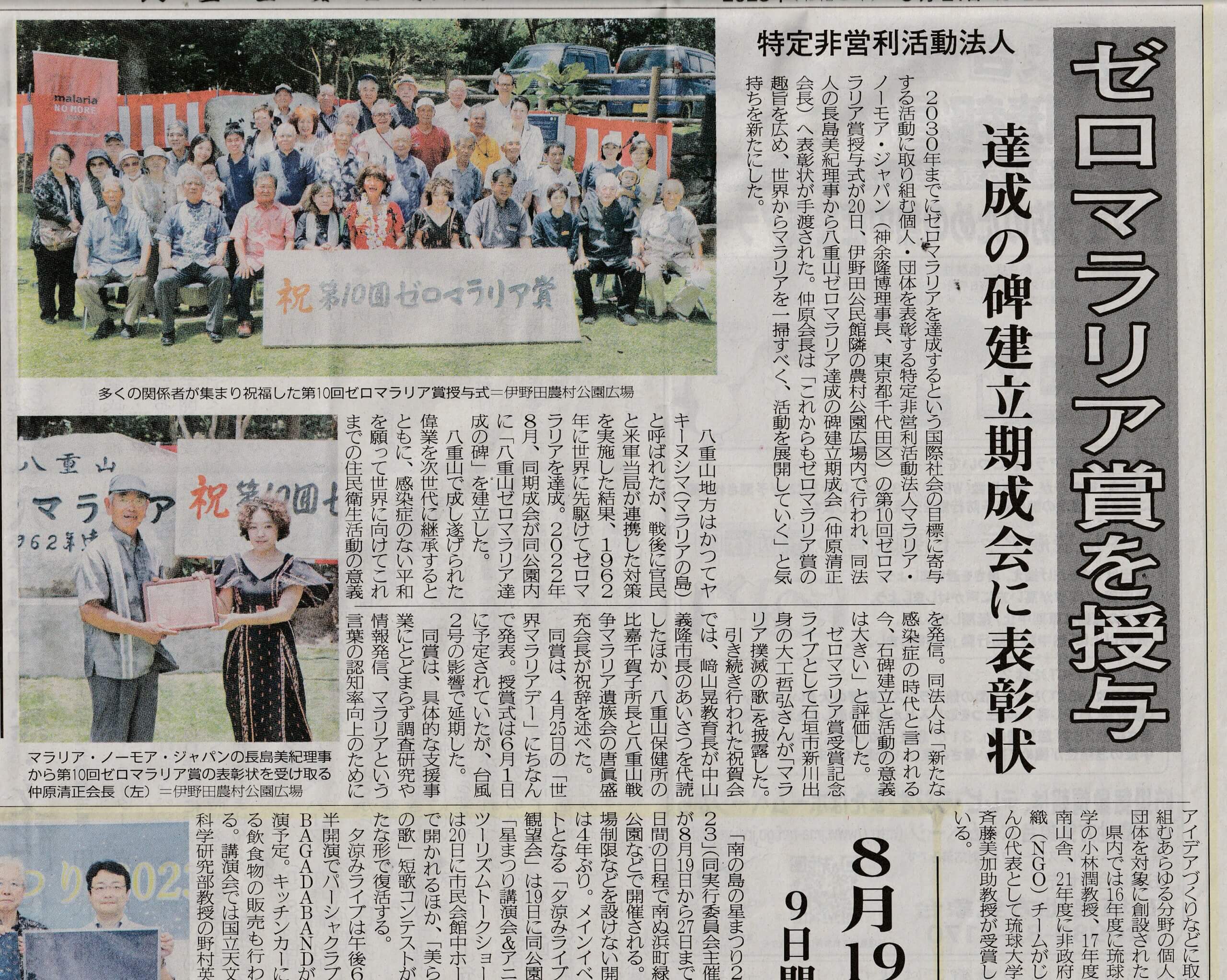 八重山ゼロマラリア達成の碑建立期成会が見事受賞されました。