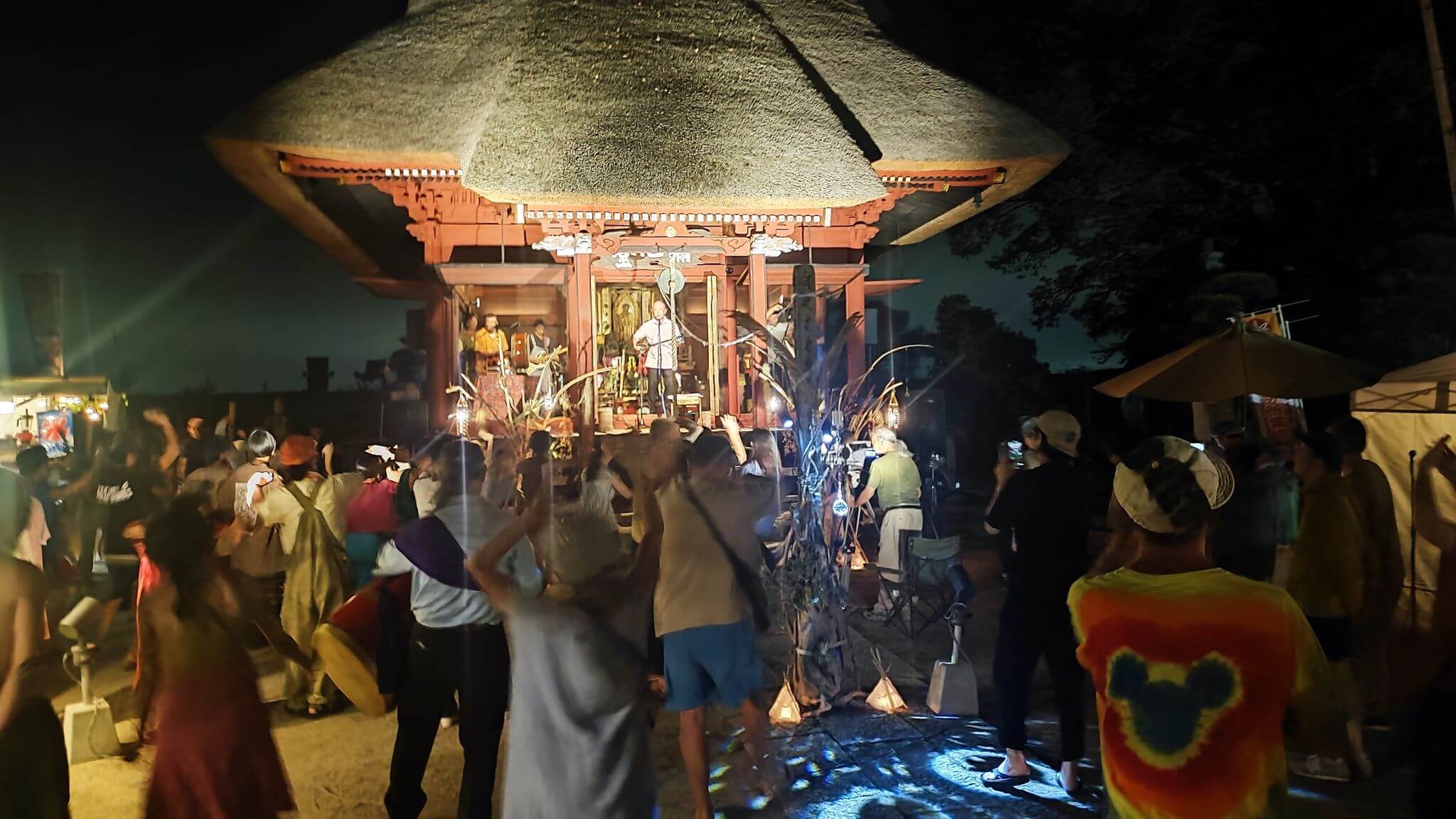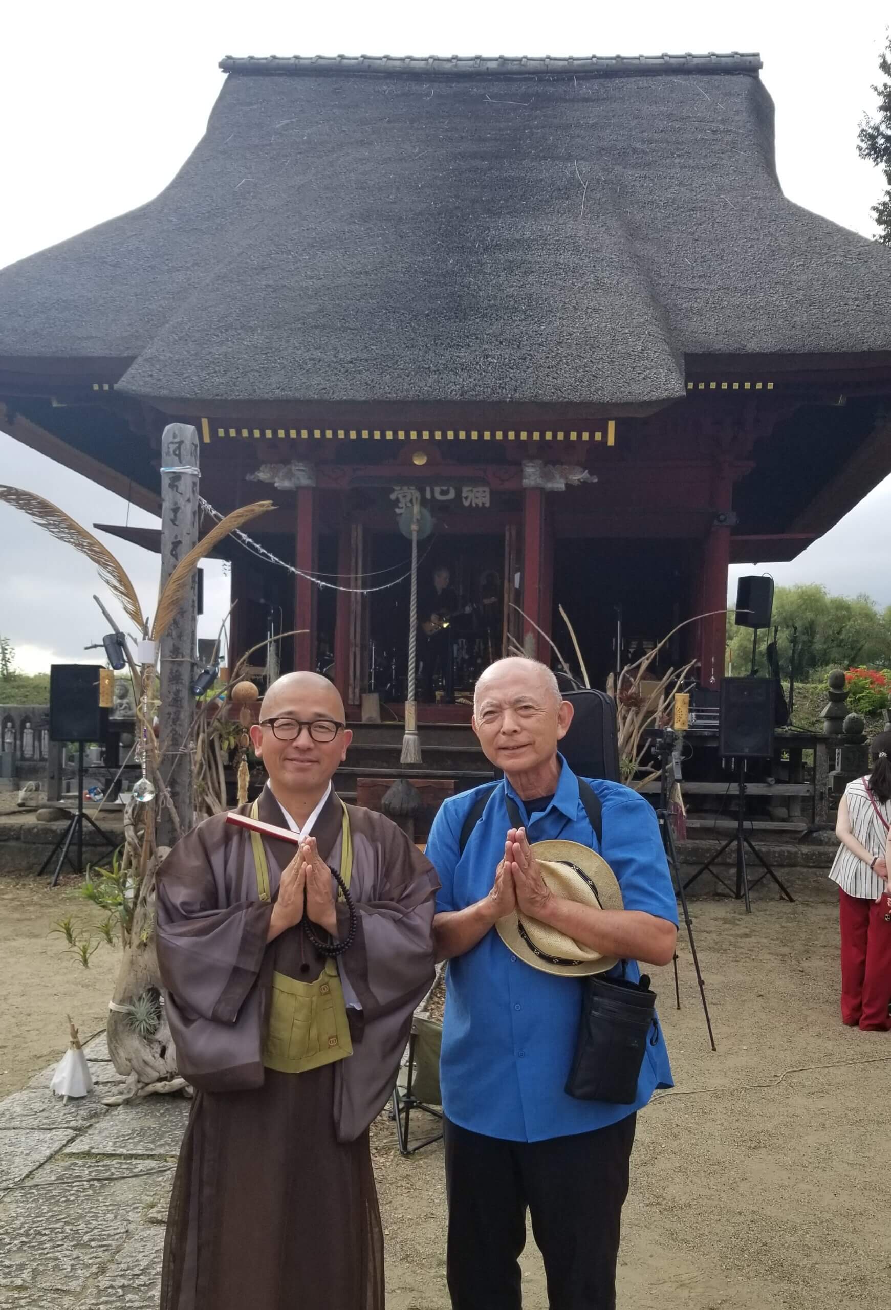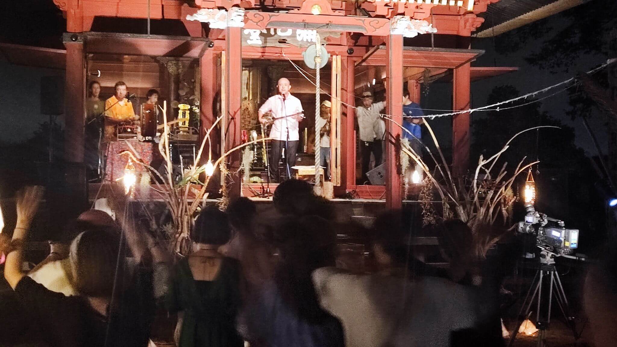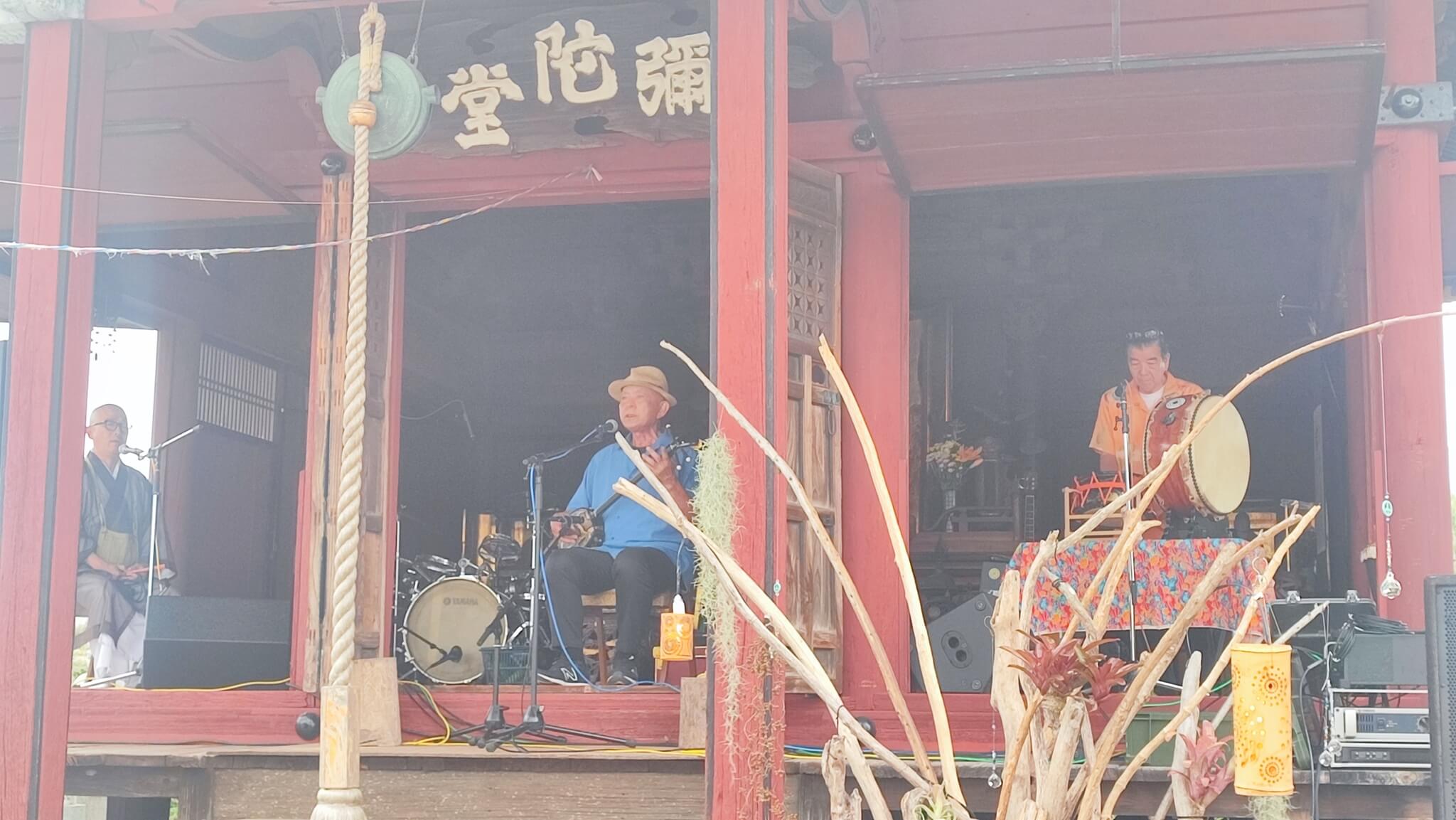 太平洋戦争で沖縄出身の新垣さんが戦闘機で戦死、遺骨を常楽寺に納められていることから、弔う意味でオープニングは住職のお経と「無蔵念仏節」でコラボ、供養させて貰いました。