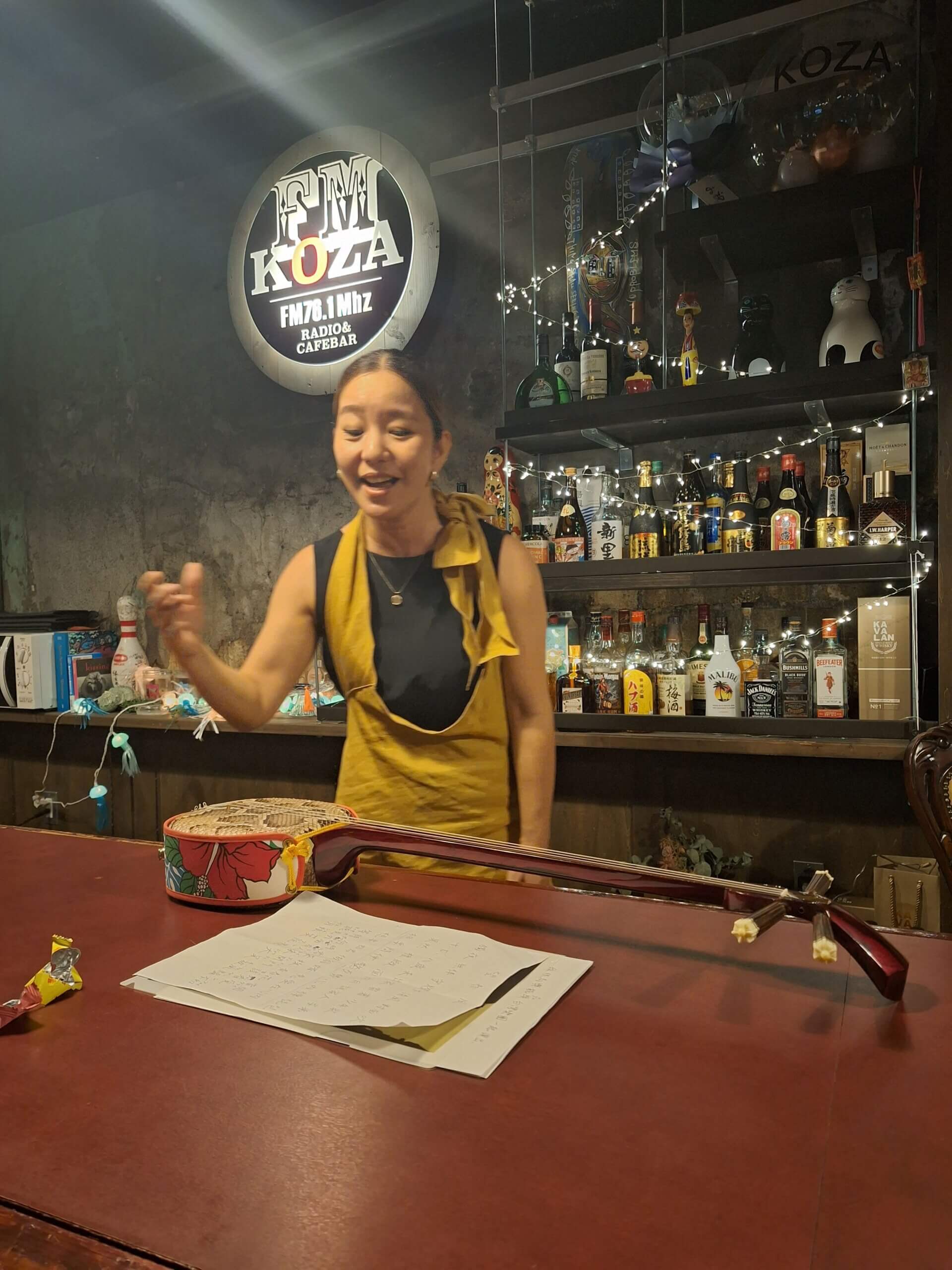はっちゃん。すごく歌が上手で、台湾の歌、八重山の歌を勉強中だという。(FMコザのカフェで)