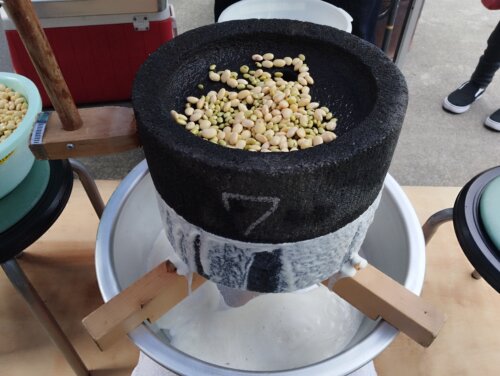 春分の日。息子と歩いて近所のお祭りへ。 お目当ては手作りゆし豆腐体験。 石臼をくるくる回すと白い豆乳が下からどんどん …